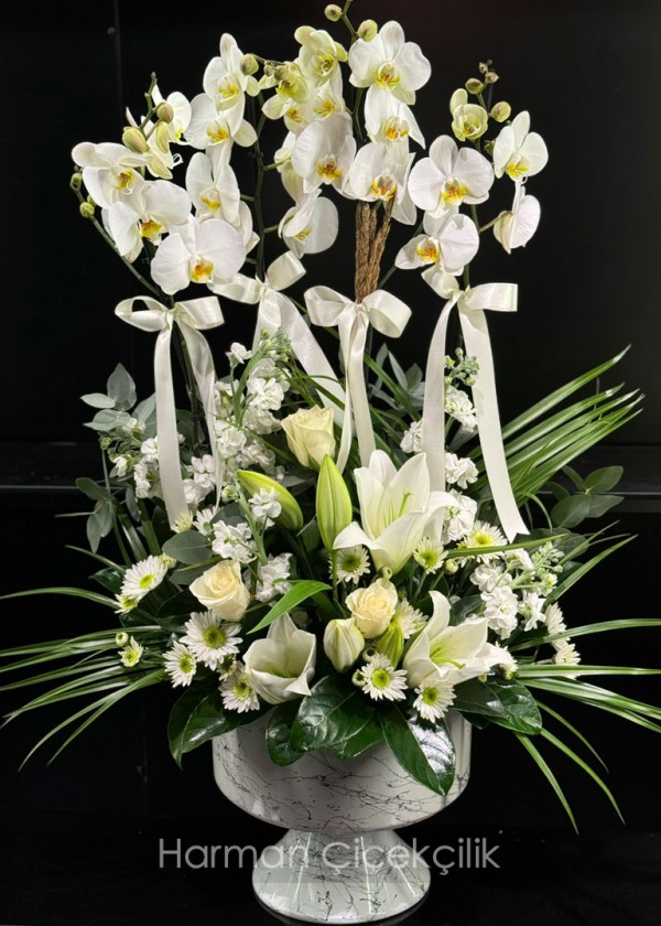 Dekoratif ayaklı vazo içerisinde 4 dal beyaz orkide ve alt kısmında beyaz lilyumlar güller ve mevsim çiçekleri ile dolu dolu oldukça göz dolduran ve gösterişli olarak hazırlanmış tasarım.