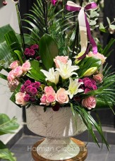 Ayaklı seramik vazo içinde 4 dal beyaz 2 dal fuşya phalaenopsis orkide ve alt kısmında pembe güller, beyaz lilyumlar ve krizantemler ile hazırlanmış gösterişli tasarım. Yaklaşık ürün yüksekliği 80 cm